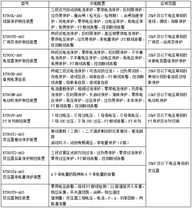 RT900X-A60系列保护测控装置适用于工业和民用35kV及以下电压等级的主变压器、配电系统的线路(包含母联及备自投保护)、厂用变及站用变、并联电容器、电动机、PT及其并列的保护、测量、控制和管理,实现配电系统的无人值守和智能管理。
